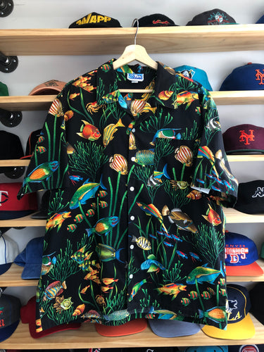 Vintage Wave Floral Fishes Button Down Shirt Size XL