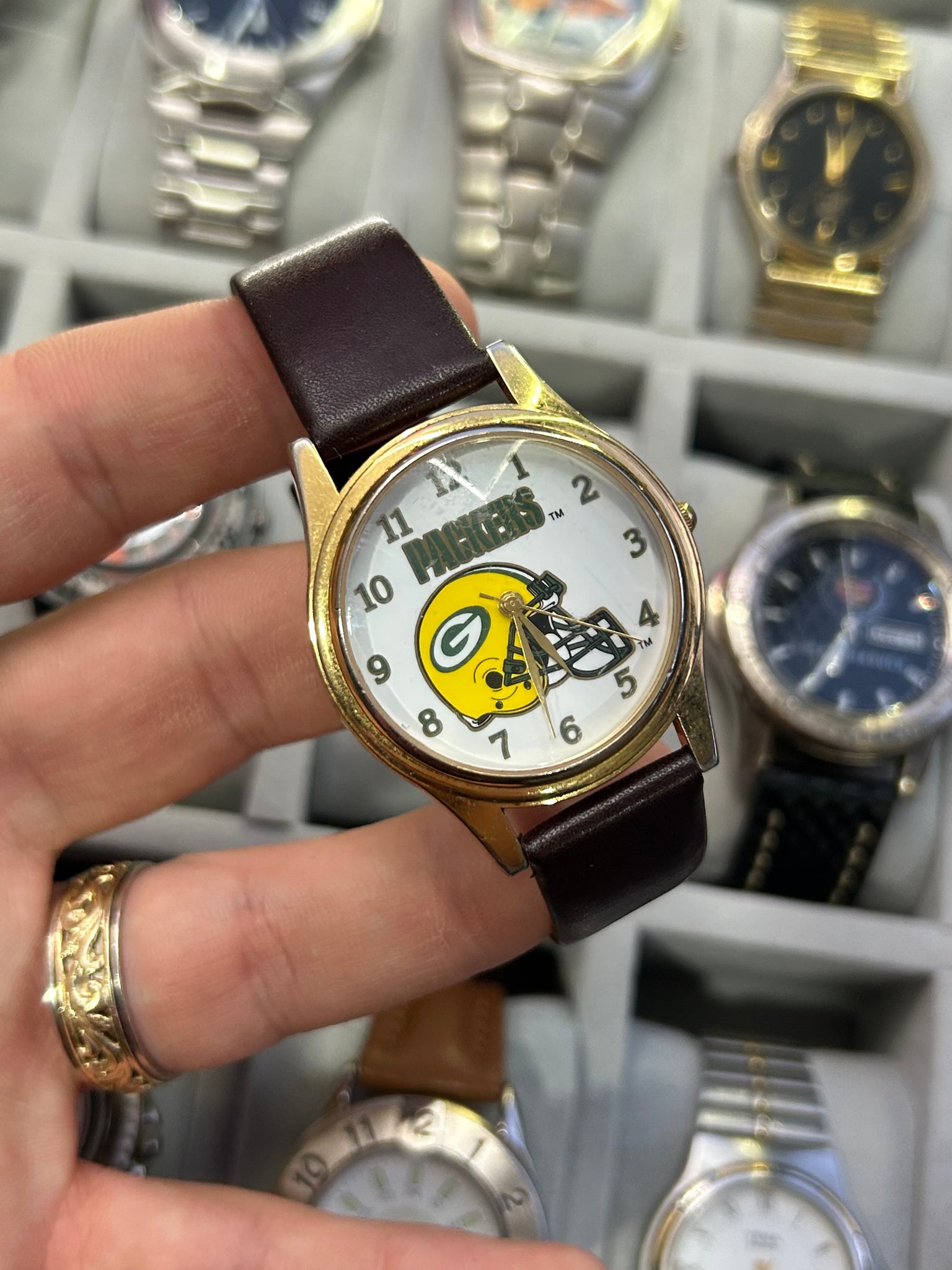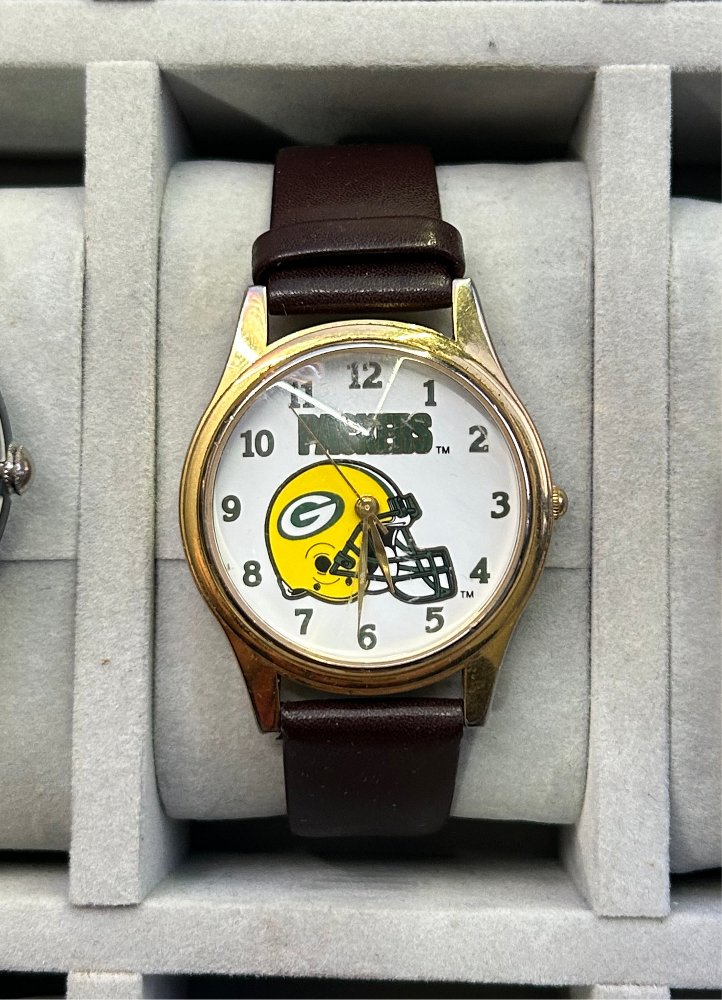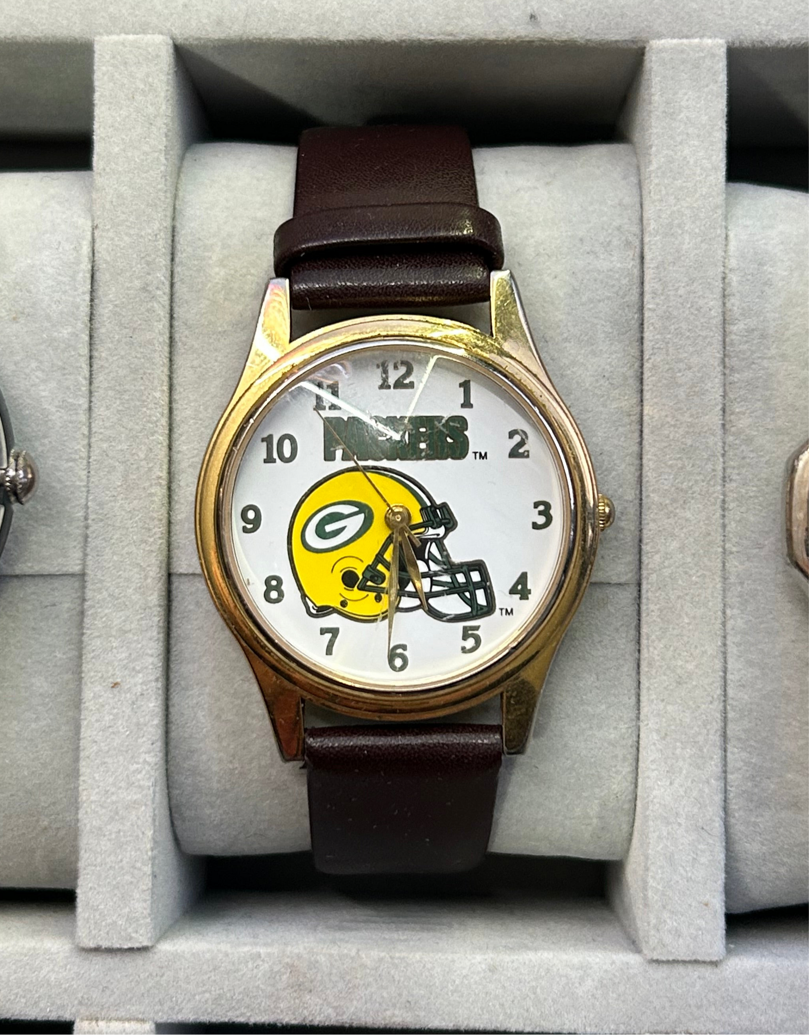 case is in great shape with minimal plating wear . Crystal has light scratches. Cool piece for a packers fan